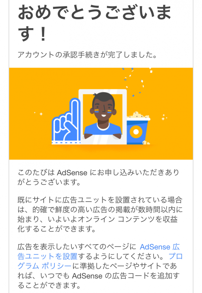 本文を見ると、アドセンスを合格したブロガーのサイトでよく見るあの画像です。「もしかして、これって合格ってこと?」と半信半疑ながらも、年末の思いがけない承認メールに一人喜んでいました。この時は、次の日に非承認メールが来るなんて、夢にも思いませんでした。