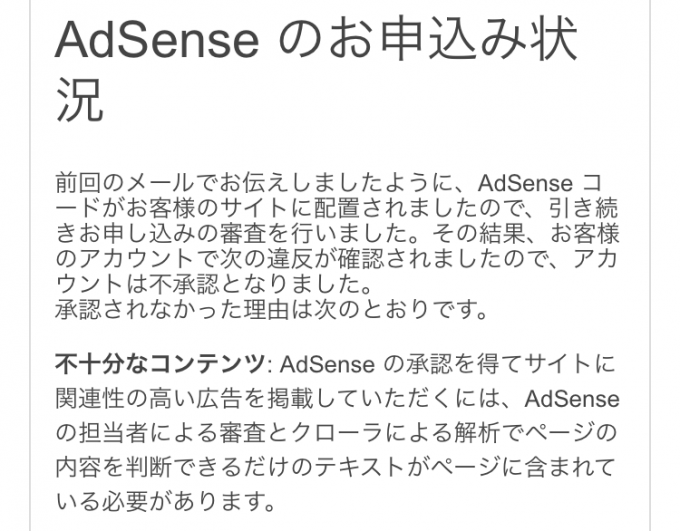 その時、「Google AdSenseアカウントのステータス」という題名のメールが届きました。メール本文を読むと、「不十分なコンテンツ」という違反が確認されたのでアカウントは不承認となったとのこと。